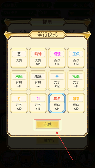 2、抓周仪式中,可以选择【鸣钟】【铜镜】等物品提升对应属性,选后点击完成确认操作。