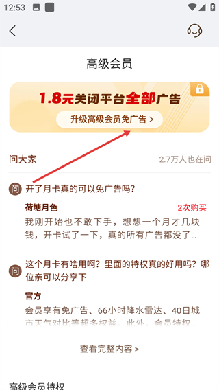 3、在高级会员页面点击【升级高级会员免广告】,弹出开通窗口。