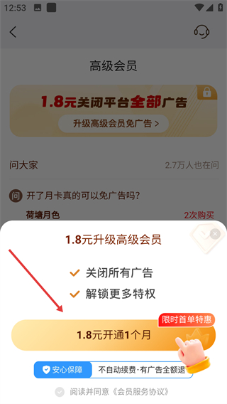 4、勾选“阅读并同意”协议后,点击【1.8元开通1个月】,完成支付即可升级为高级会员(享关闭广告、解锁更多特权等权益)。