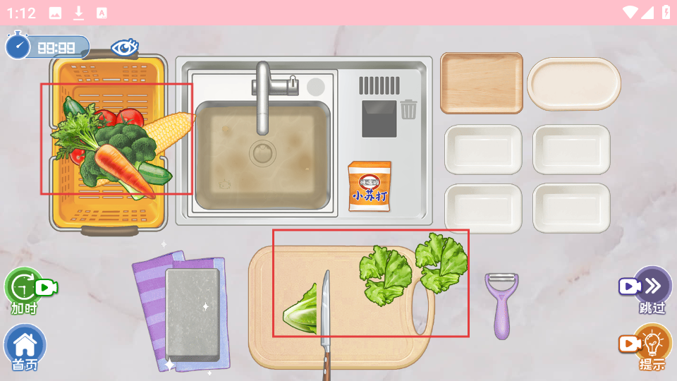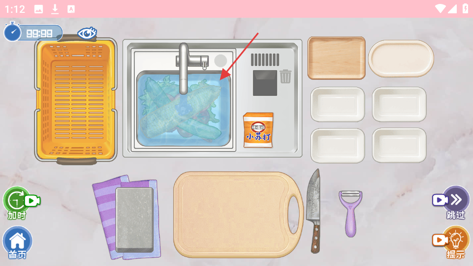 3、在厨房场景中,先将水槽里的蔬菜取出,利用旁边的工具完成清洗步骤,为后续收纳做准备。