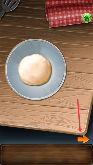 3、将面团放置在盘子后,点击下方箭头按钮,进入下一步的披萨制作工序。