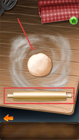 4、使用红框内的擀面杖工具,擀制面团以塑形,完成披萨饼底的制作,推进后续配料步骤。