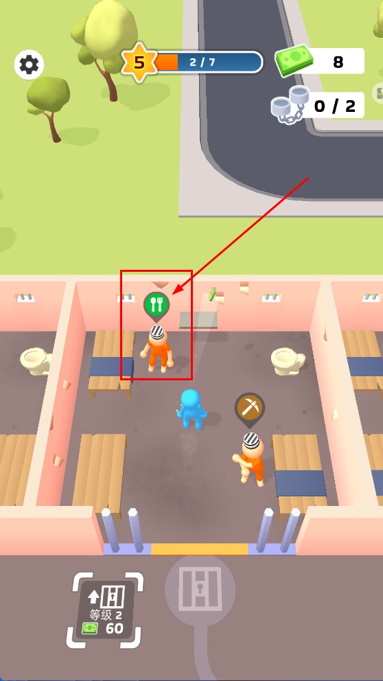 4、观察带有笑脸标识的囚犯,及时响应其进食需求,提升改造效率与监狱运营评分并且获取报酬。
