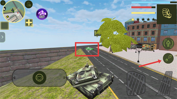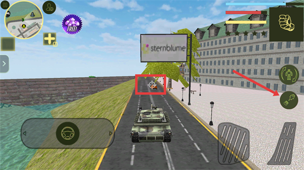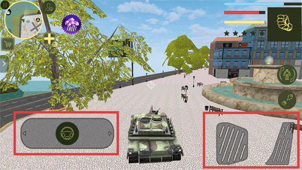 2、坦克形态下,利用左侧红色框内的方向盘按钮控制方向,右侧红色框内的踏板按钮控制车速。