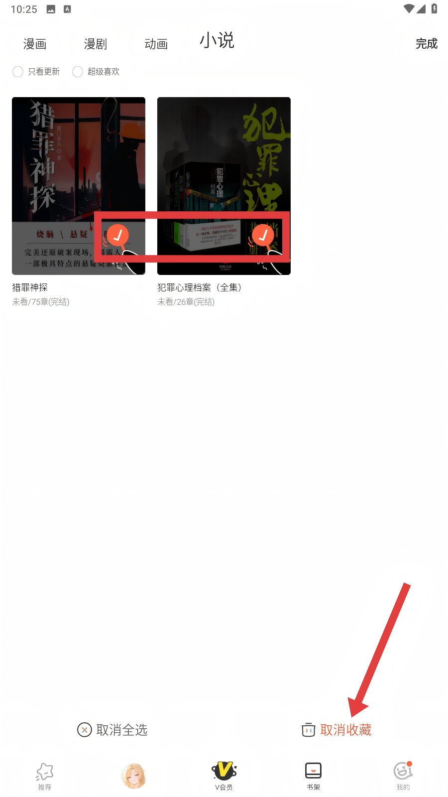 4、在书架界面选中要取消收藏的小说后,点击【取消收藏】,即可解除该小说的收藏状态,操作简单便捷。