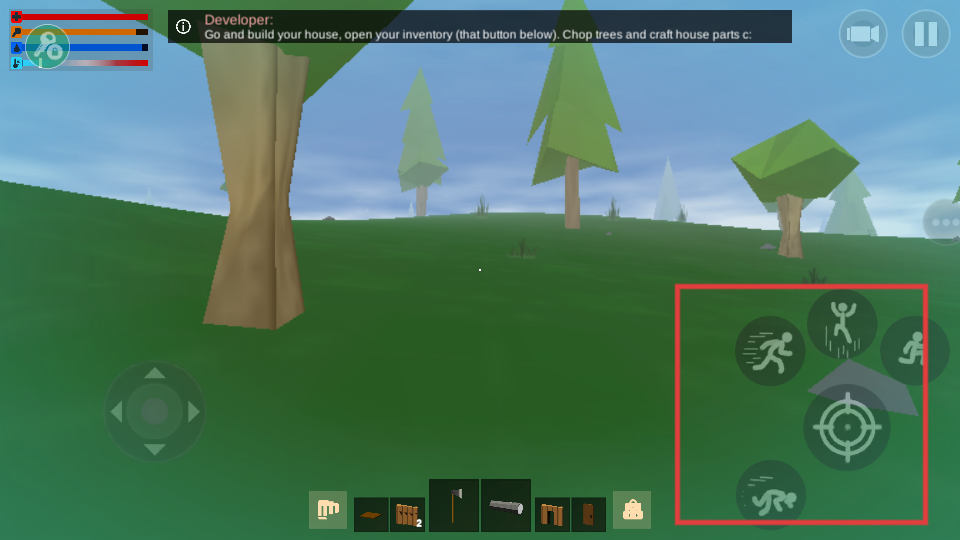 4、利用右侧功能按钮,执行动作,收集资源,建造房屋,推进生存任务。