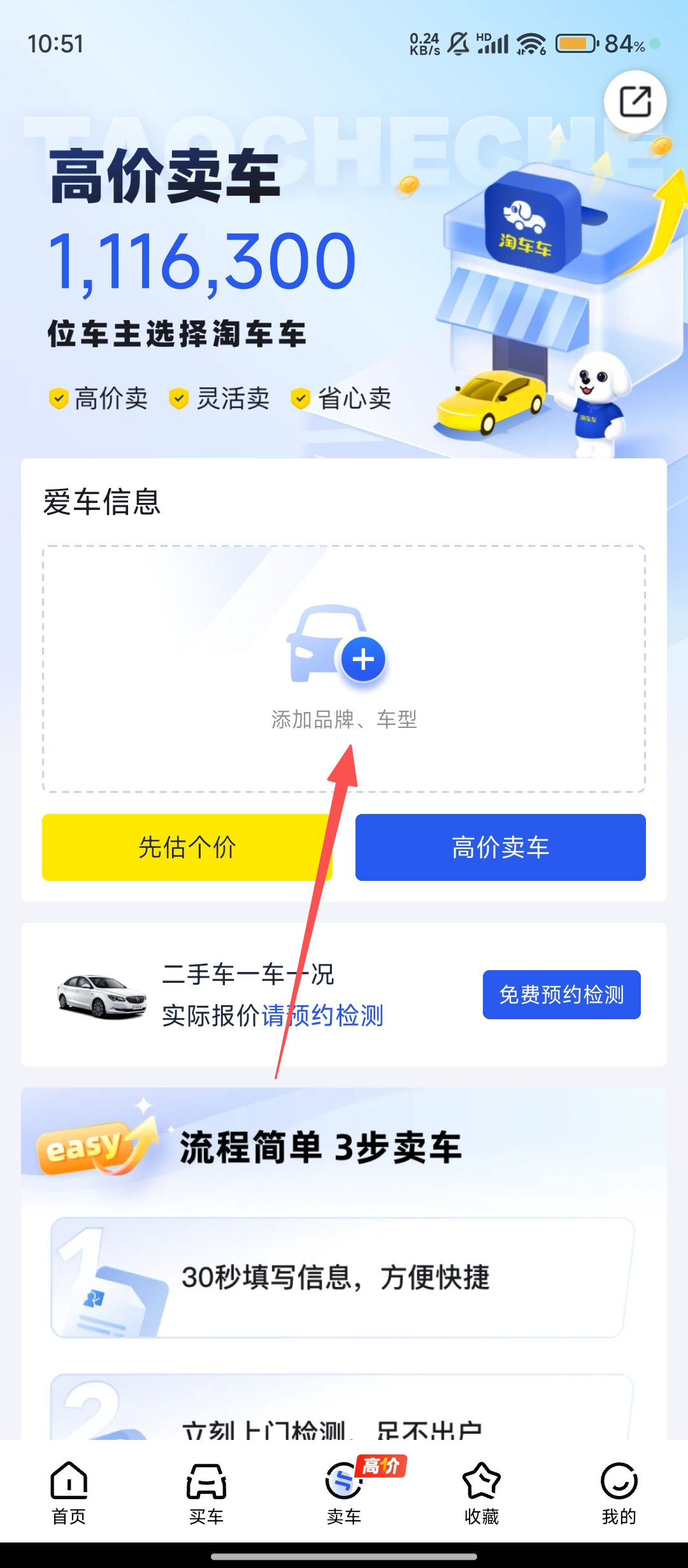 2、进入高价卖车页面后,点击【添加品牌、车型】的按钮,开始填写爱车信息呢。