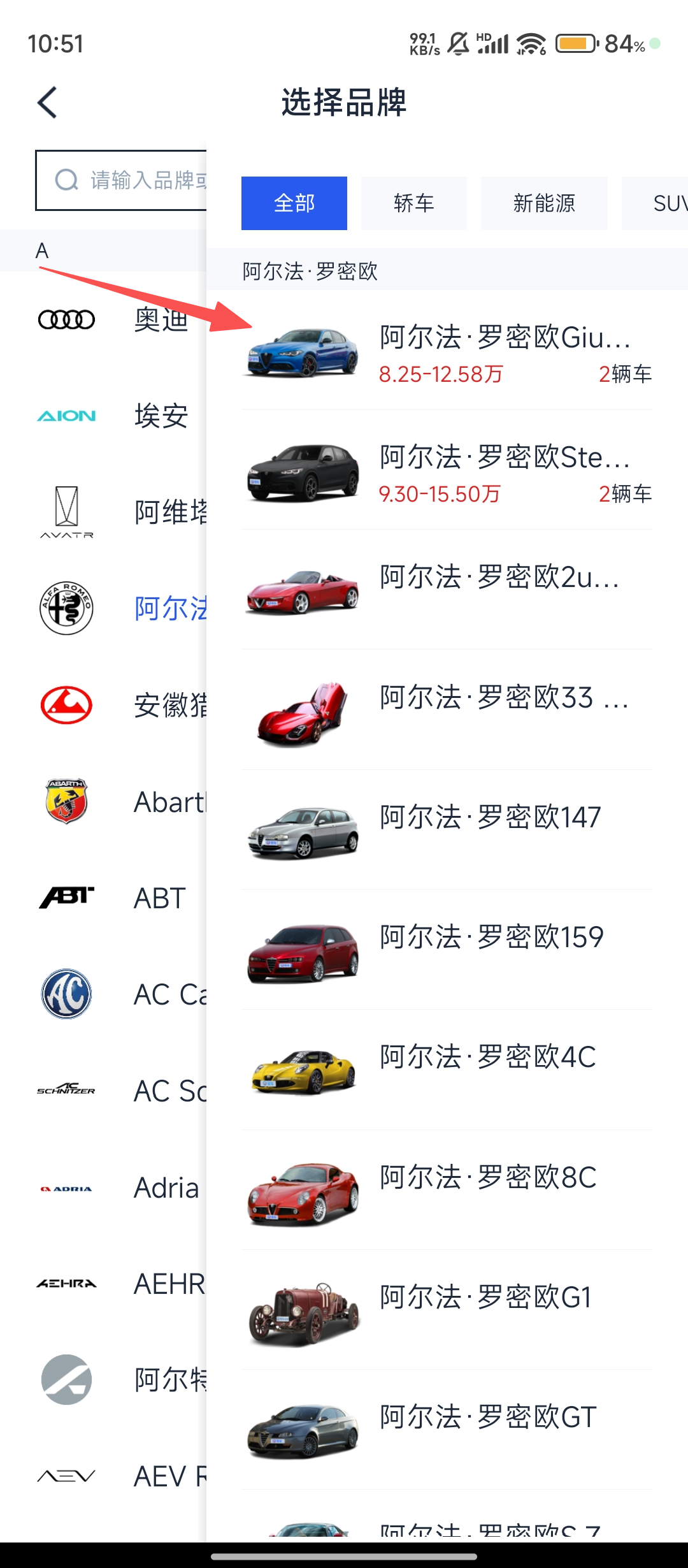 3、在选择品牌页面,找到并选择自己车辆对应的品牌,如【阿尔法罗密欧】,再挑选具体车型呀。