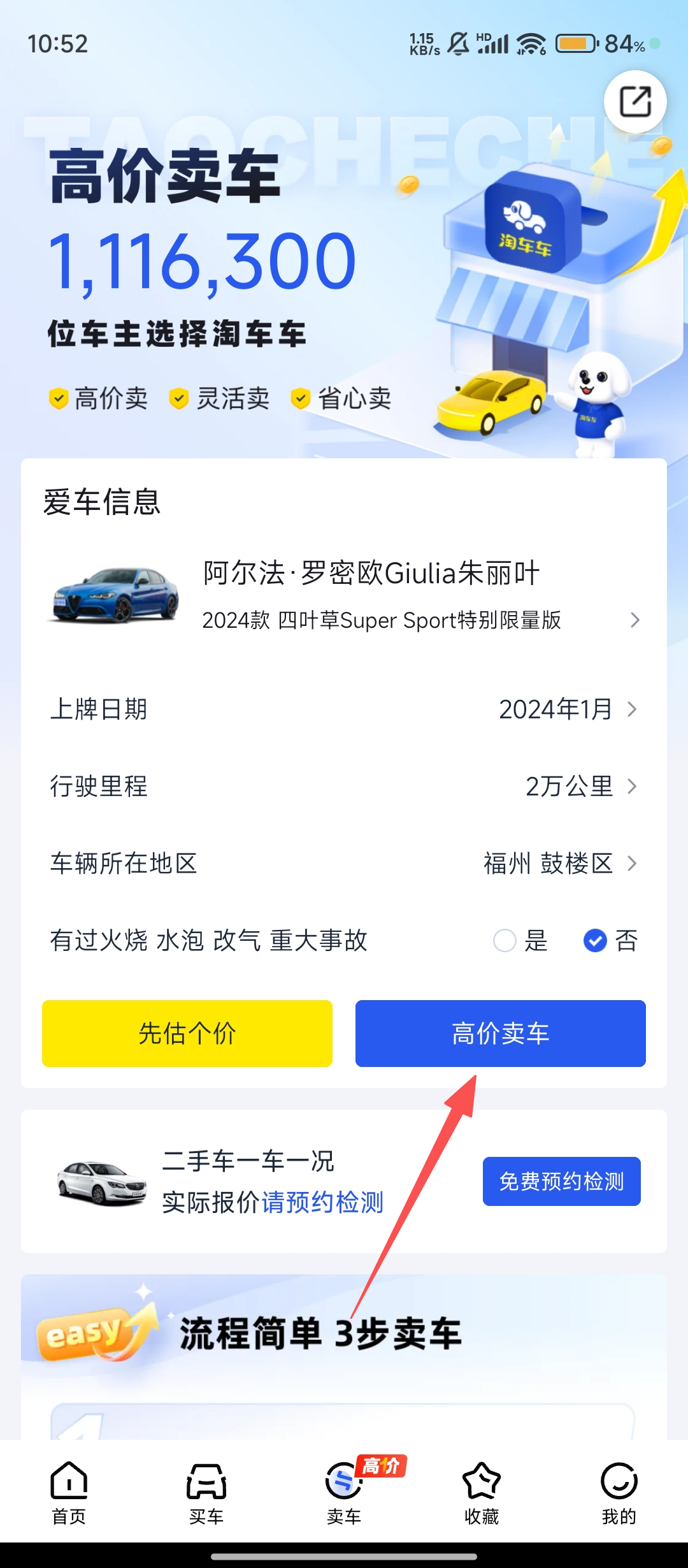 1、我们打开淘车车App首页,点击【高价卖车】选项,即可进入卖车流程,开启车辆售卖之旅哦。