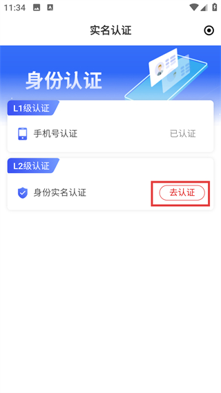3、进入【实名认证】页面后,在【L2级认证】下找到【去认证】按钮,点击可进行身份实名认证操作。