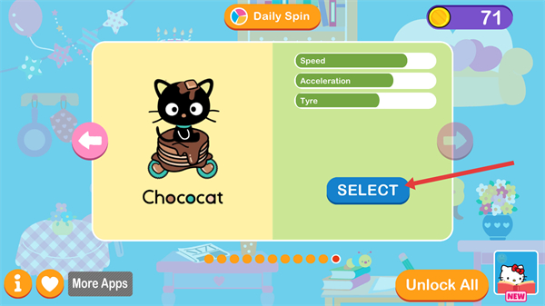 1、在角色选择界面,点击【SELECT】按钮,选择Chococat角色开始游戏。