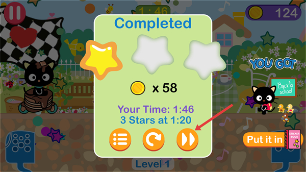 4、关卡完成后,点击红色箭头指向的按钮,进入下一个关卡继续挑战。