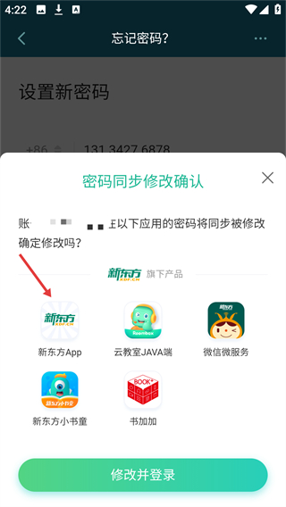 4、在密码同步修改确认弹窗中,确认关联产品后点击【修改并登录】,完成密码修改。
