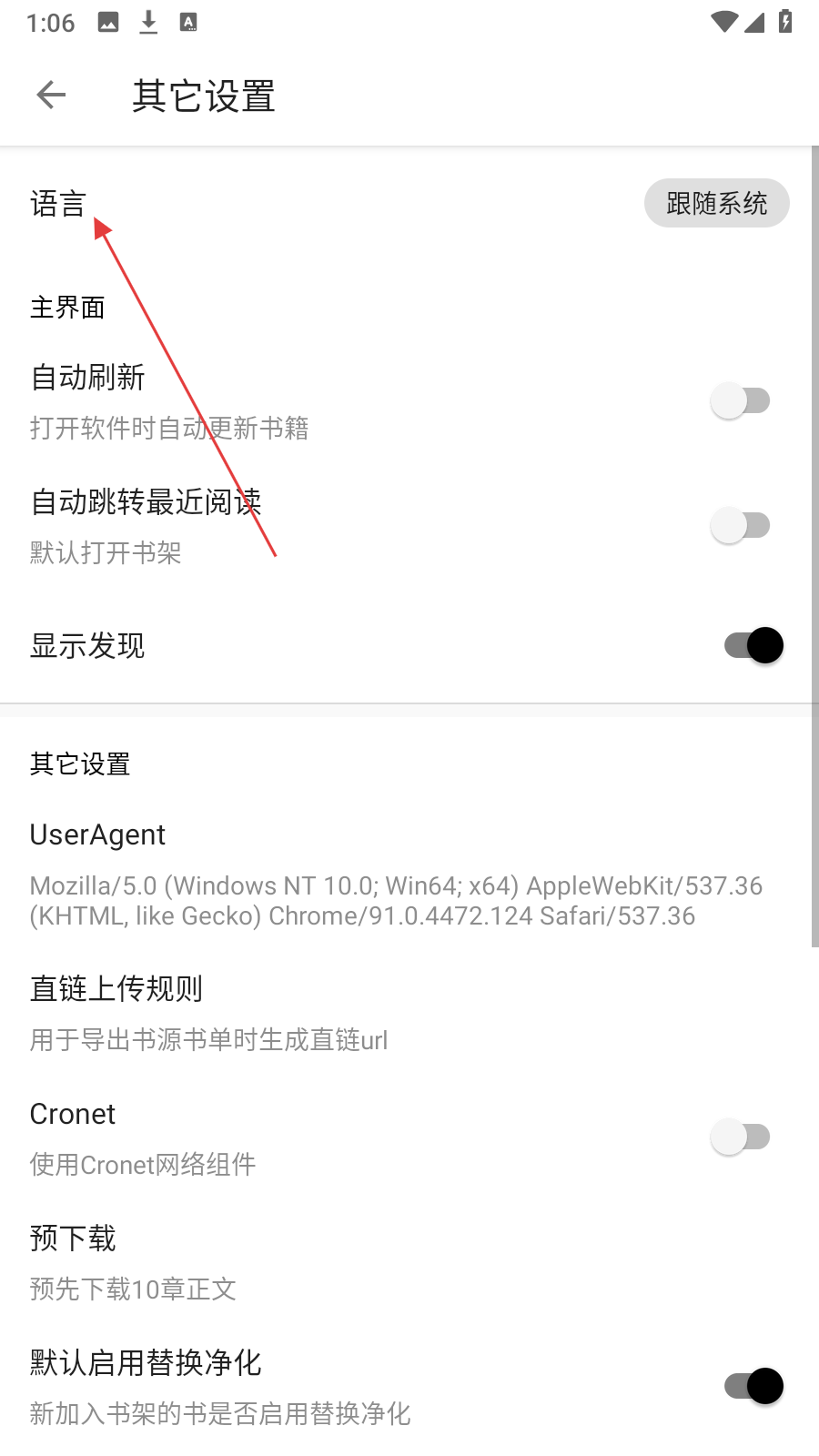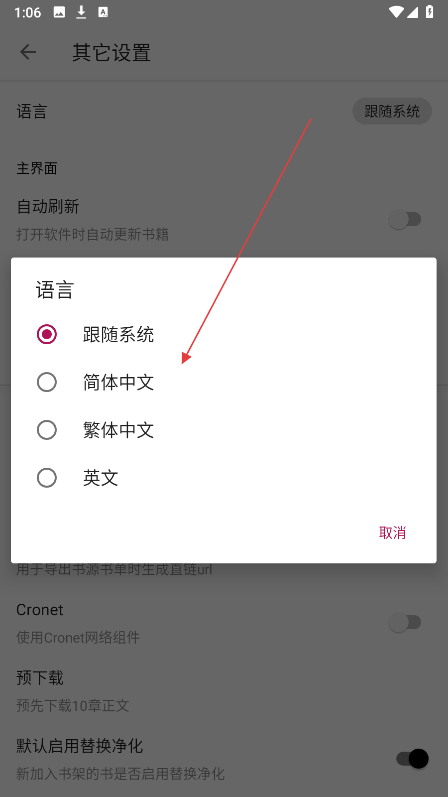 3、在其它设置页面,点击【语言】选项,弹出语言选择窗口。
