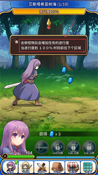 1、在艾斯塔希亚树海区域,击败怪物可提升任务进度至100%,从而进入下一个区域,同时能收集蓝色宝石助力塞尼亚成长。