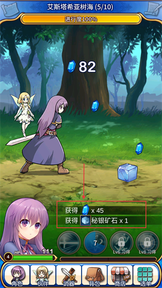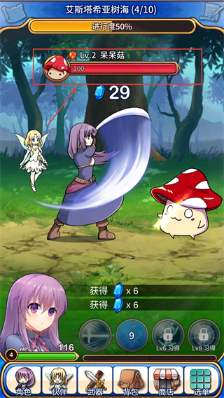2、面对Lv.2呆呆菇时,持续攻击将其击败,可获得蓝色宝石奖励,积累资源以推进艾斯塔希亚树海的探索进度。