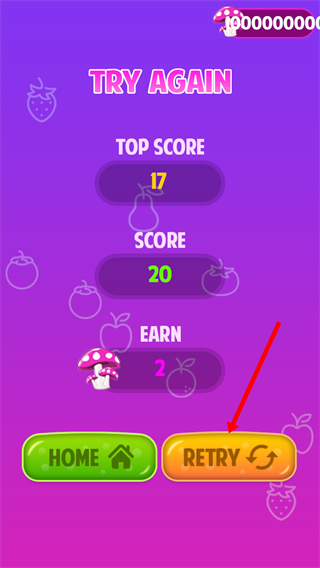 4、游戏结束后,点击【RETRY】按钮重新开始游戏,挑战更高分数。