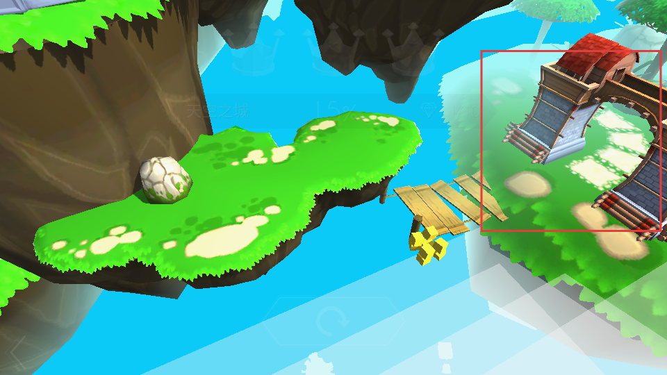 3、在有石块的浮空岛区域,注意路径变化,顺利通过木桥前往建筑处。