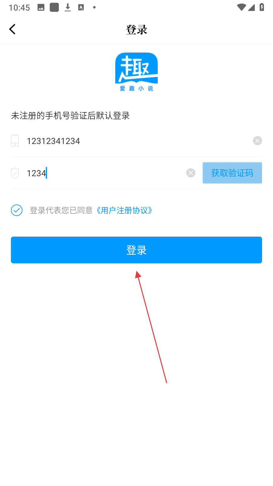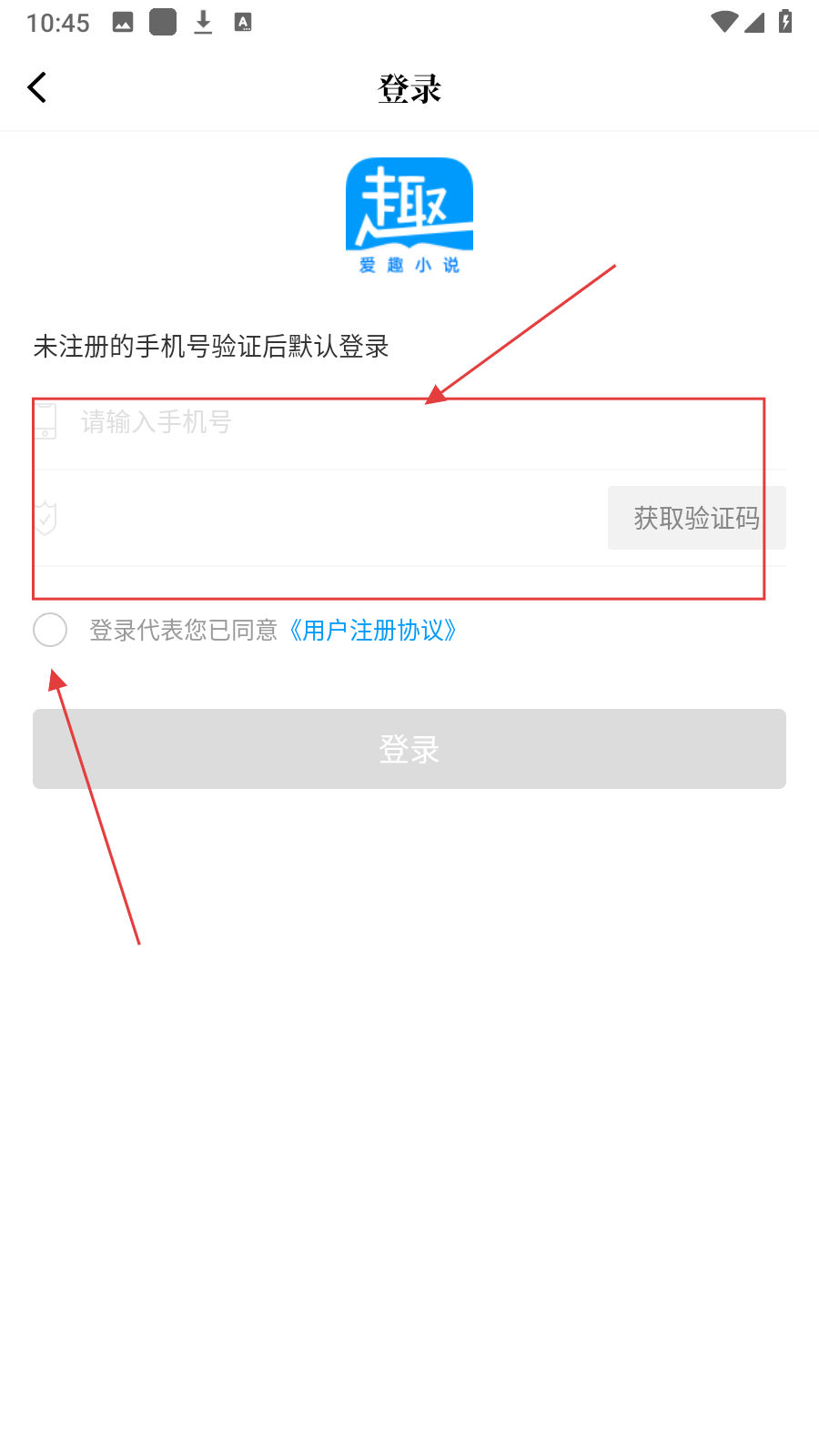 3、在登录页面,输入【手机号】获取并【输入验证码后】,勾选【协议】。