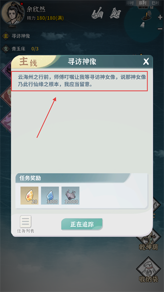 1、接取主线【寻访神像】任务,完成后可获得【70】-【3800】-【10000】奖励,推进修仙剧情。