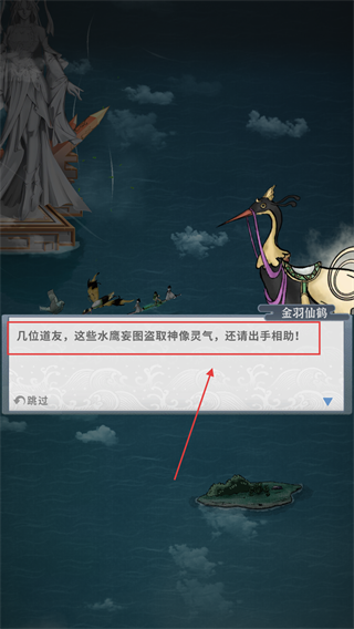 4、接受【金羽仙鹤】的求助,出手对抗水魔保护神像灵气,获取修仙资源并推进剧情。