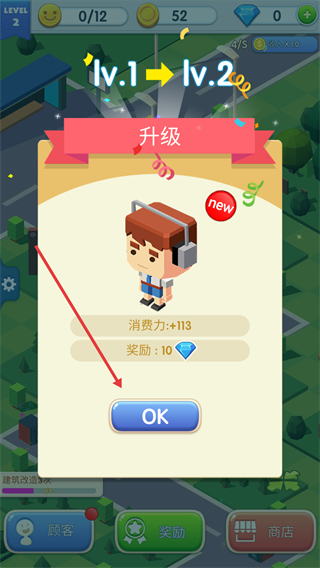 1、顾客升级至Lv.2后,消费力+113并获得10钻石奖励,点击“OK”确认后可提升店铺收益效率,助力资源积累。