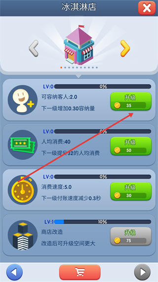 2、冰淇淋店界面中,优先升级“可容纳客人”(消耗35金币),提升客流承载量,为后续人均消费、消费速度升级奠定基础。