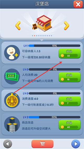 3、汉堡店已升级“可容纳客人”至Lv.1,当前可升级该属性(消耗32金币),持续提升客流上限以扩大收益规模。