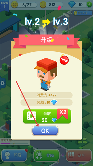 4、顾客升级至Lv.3后,消费力+429并可领取10钻石,点击“OK”确认,或消耗20钻石双倍领取,快速积累钻石资源。
