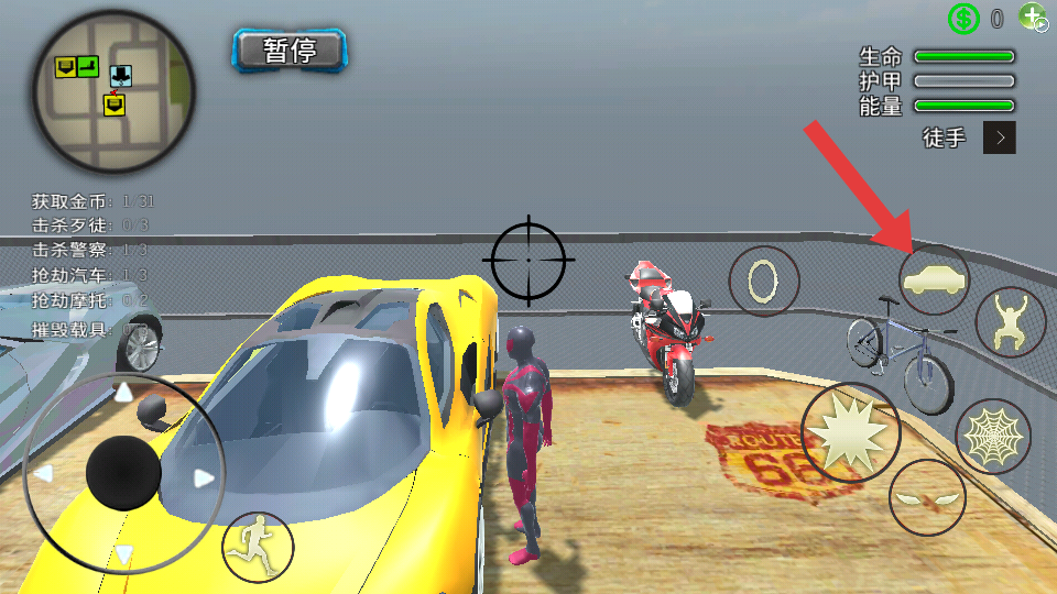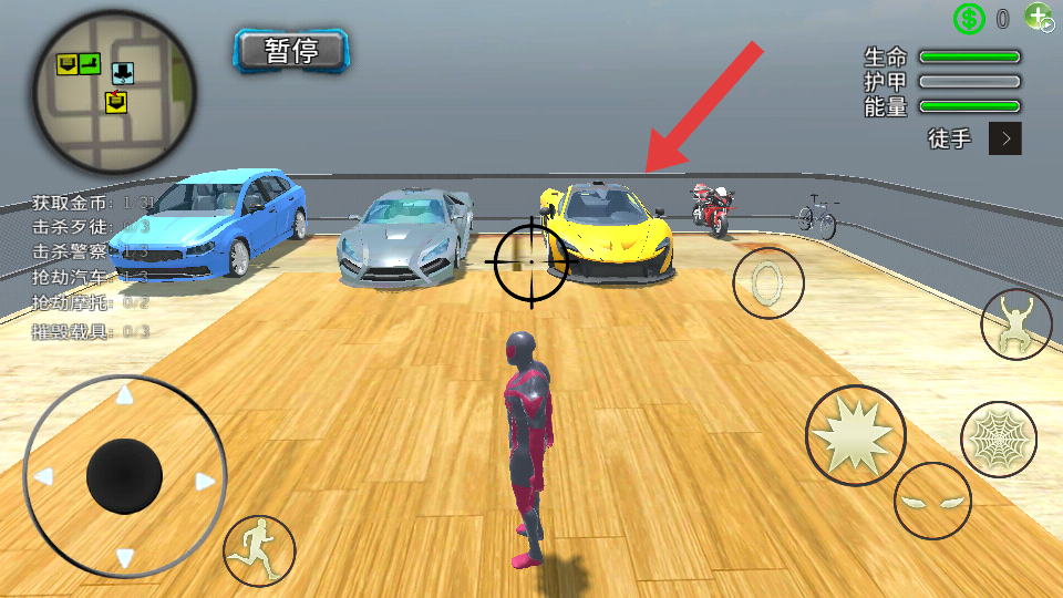 2、进入游戏后,找到想要驾驶的车辆,比如黄色跑车,然后操作移动按键靠近它。