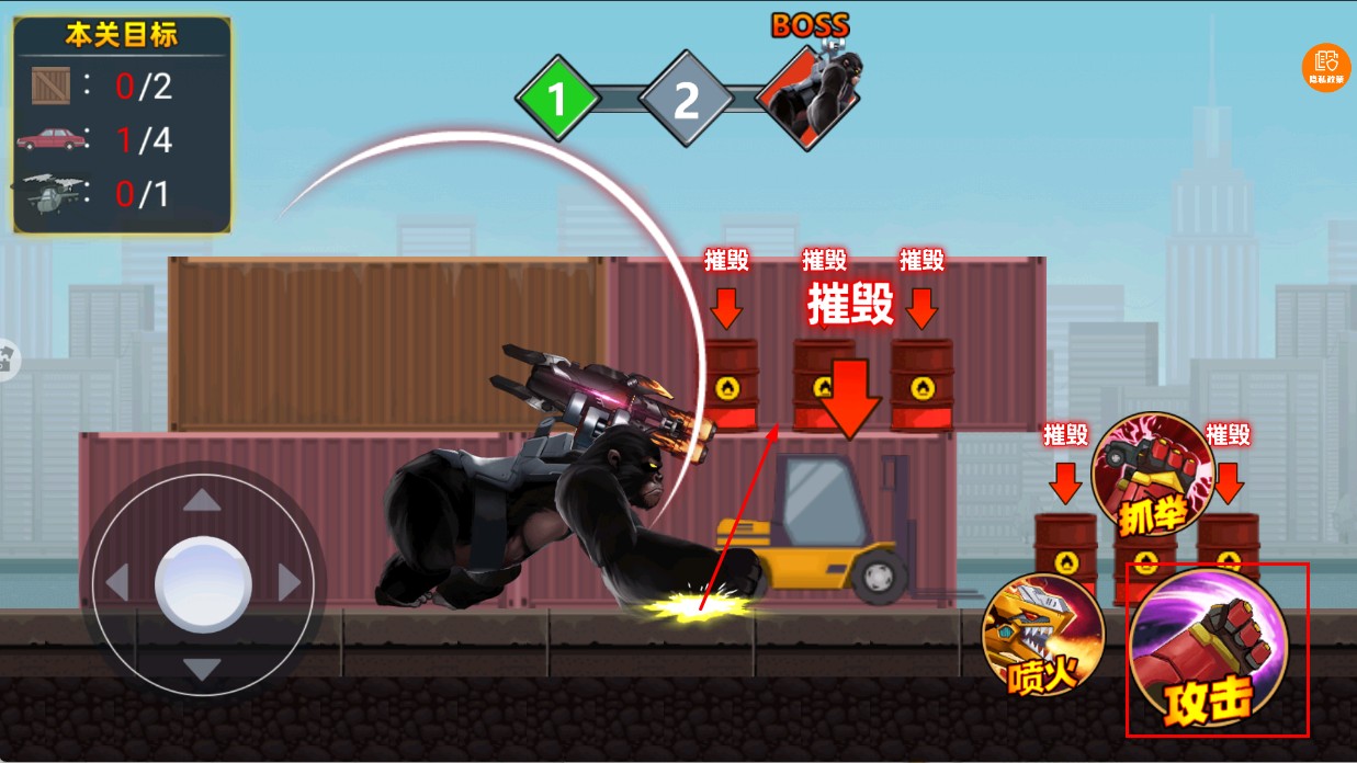 2、使用【攻击】技能摧毁场景中的油桶与集装箱,积累伤害进度推进本关目标的完成。
