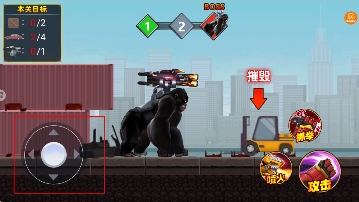 3、通过【方向控制】按钮移动怪兽位置,瞄准前方叉车与障碍物准备后续摧毁操作。