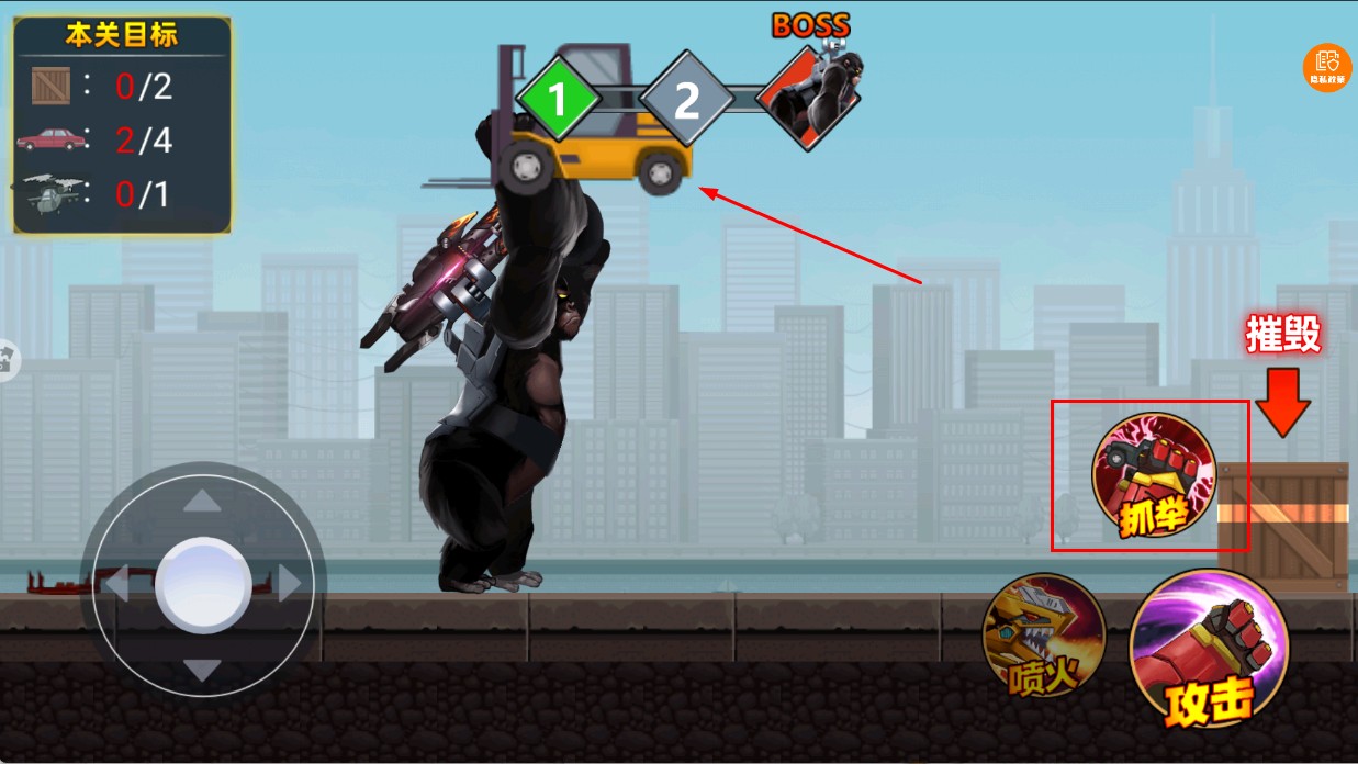 4、点击【抓举】按钮抓取场景的叉车,将其投掷快速完成本关的摧毁任务。