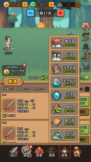4、进入修炼界面,解锁藏宝阁、仙友等功能,提升角色综合能力,推进修仙进程。