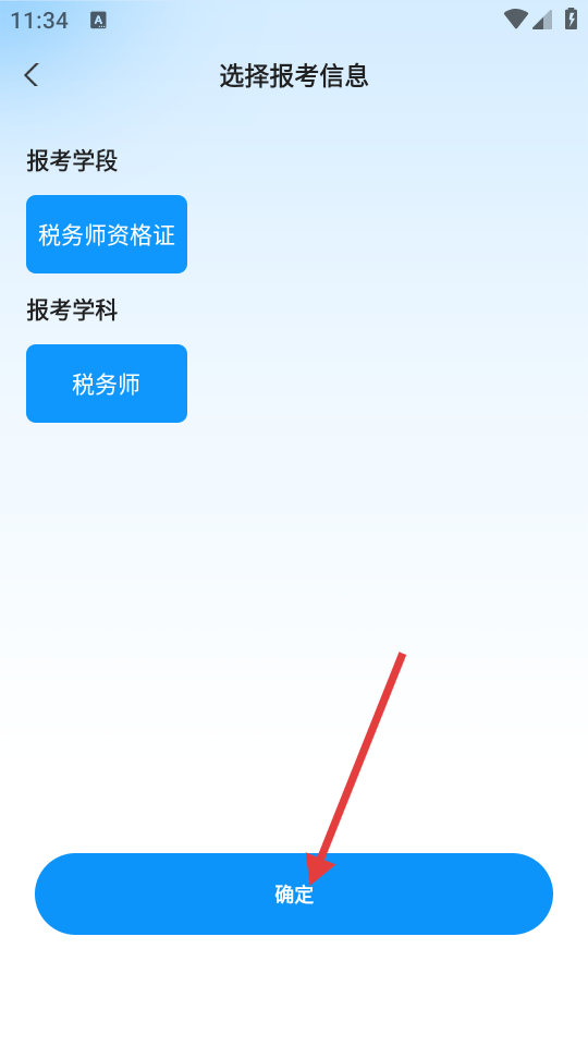 1、选好【税务师资格证】报考学段和【税务师】报考学科后,点击确定。
