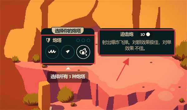 3、选择【迫击炮】炮塔时,因其对群效果极佳,适合放置在敌人密集区域,提升群体打击效率。
