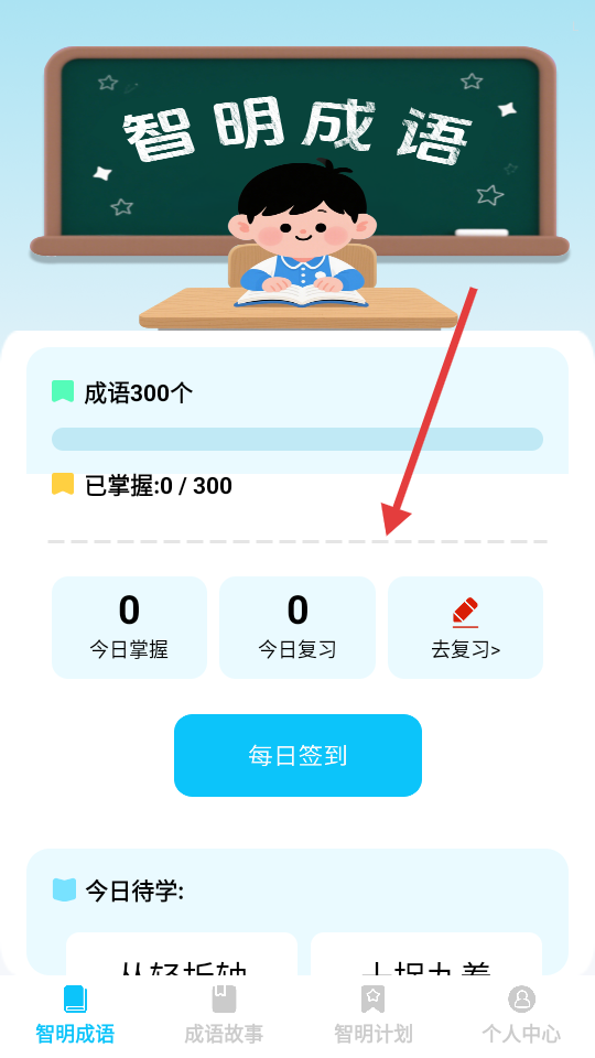 1、进入智明成语页面,可查看成语学习进度,进行今日掌握、今日复习,还能点击【去复习】或【每日签到】。