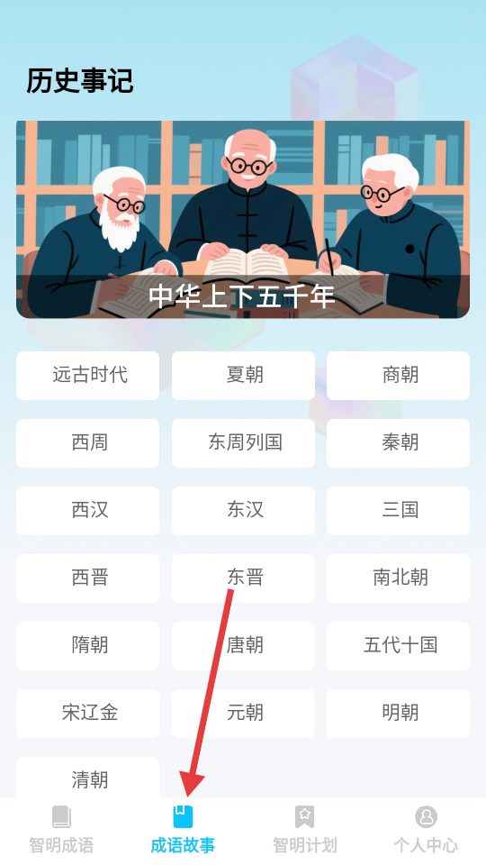 2、点击底部【成语故事】,可在“中华上下五千年”主题下,选择远古时代、夏朝等不同历史时期查看相关成语故事。