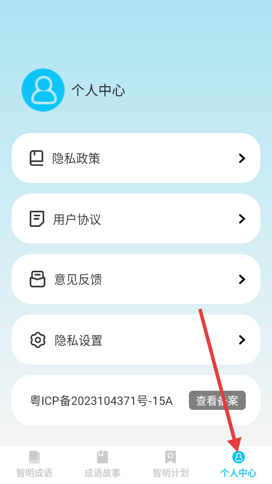 4、点击底部【个人中心】,可查看隐私政策、用户协议,进行意见反馈、隐私设置,还能查看备案信息。