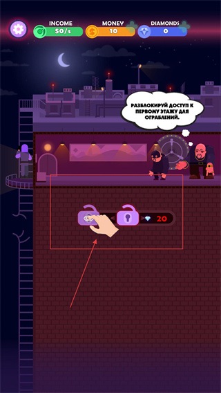 1、玩家可按提示解锁第一层权限,消耗对应资源(如20钻石)开启区域,以便后续进行物资掠夺,推进团伙的资源积累流程。