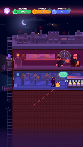 2、解锁区域后,操控Lv1劫匪角色移动至目标点,拾取黄色钱袋类物资,完成基础资源收集,为后续升级提供资金支持。