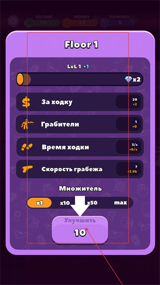 4、进入升级界面,消耗10美元提升“За-ходку”等属性,增加每次行动的收益(如+2美元),逐步强化团伙的掠夺效率。