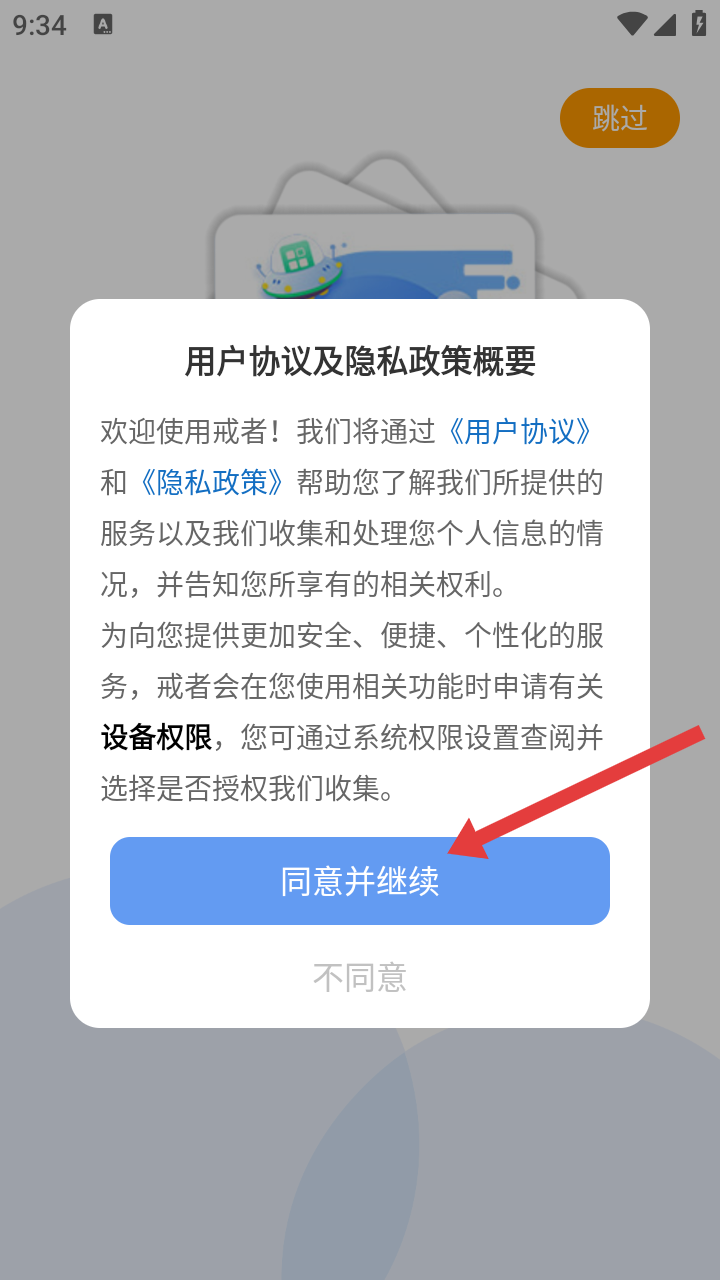 1、用户打开软件后,点击【同意并继续】进入下一步。