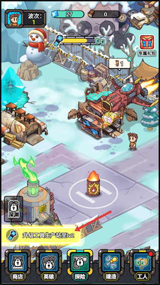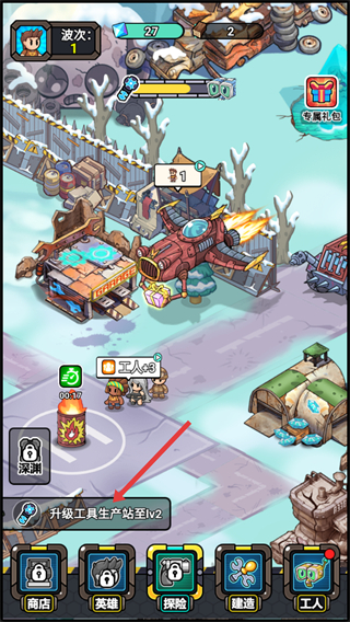 1、在游戏界面点击建筑升级提示(如“升级工具生产站至lv2”),启动建筑建造或升级进程。