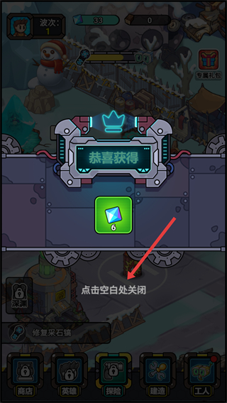 4、会获得奖励(如钻石),点击空白处关闭奖励界面,继续游戏进程。