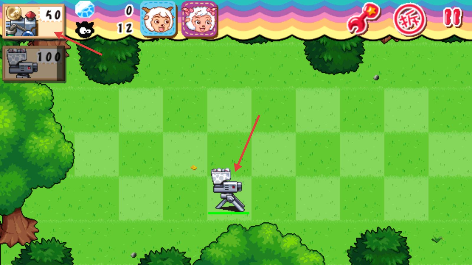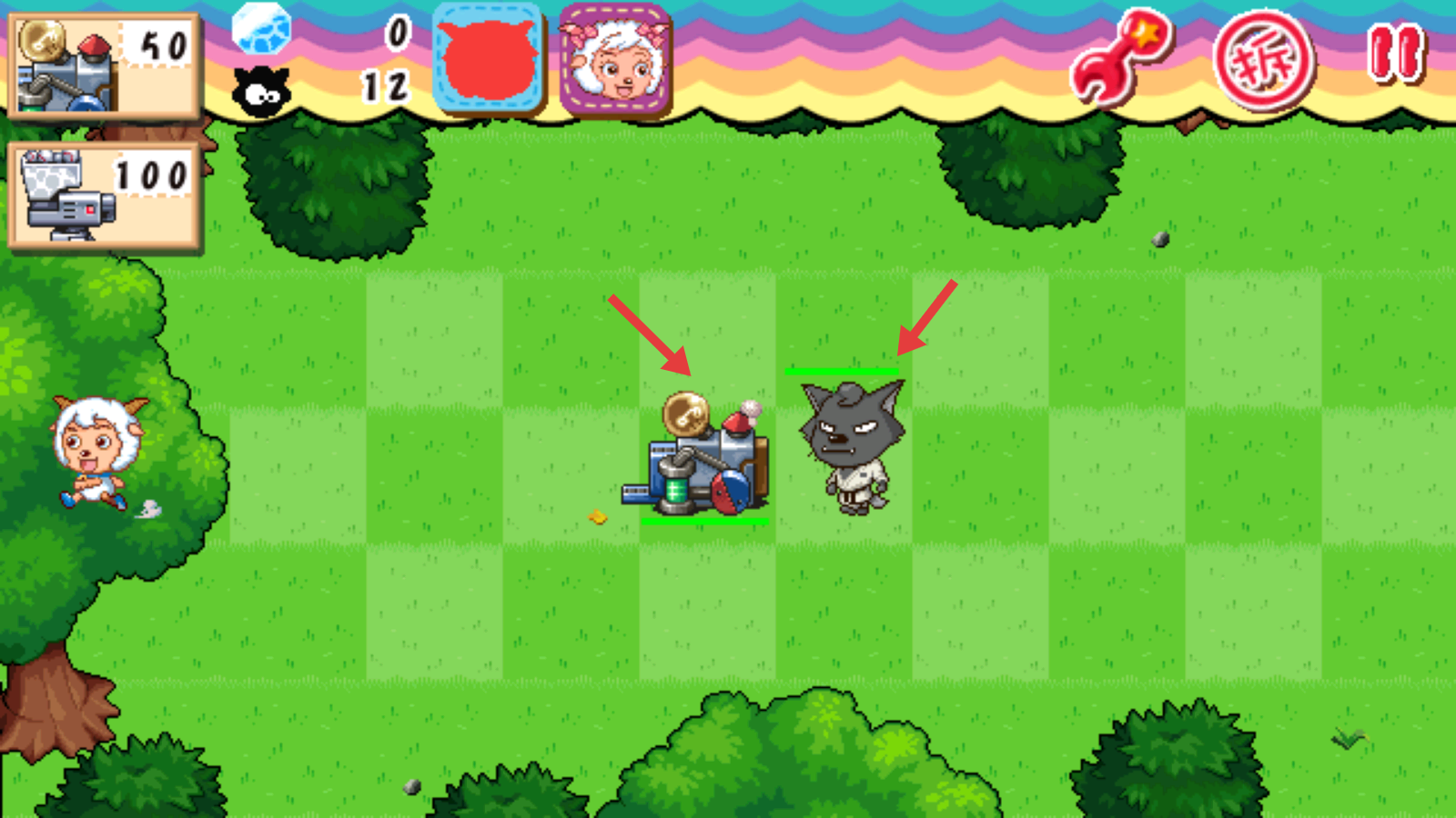 4、利用防御塔攻击红色箭头指向的狼形敌人,保卫小羊。