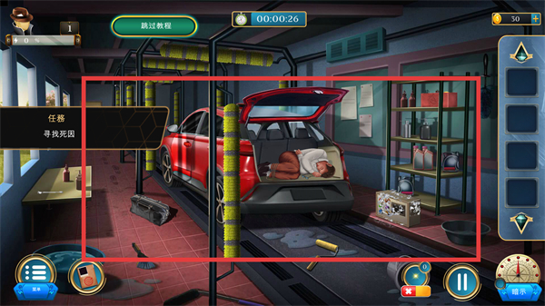 2、在场景中仔细搜寻,关注红色框内的车辆及周边物品,寻找与死因和证据相关的线索。