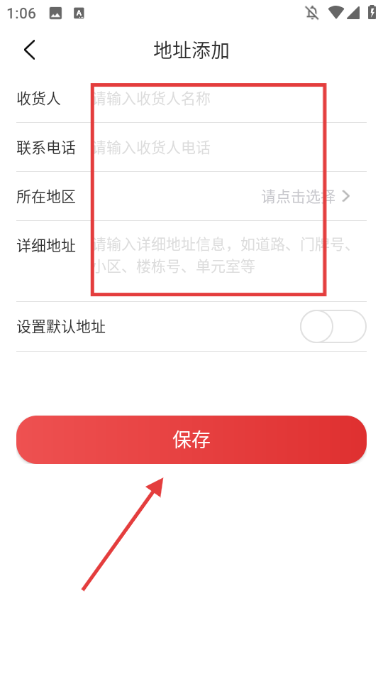 4、填写【收货人】、【联系电话】、【所在地区】、【详细地址】等信息,填写完成后点击【保存】。