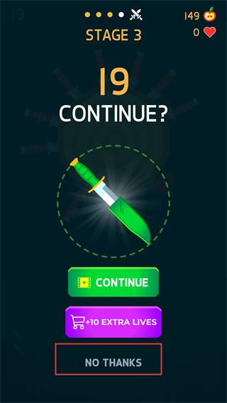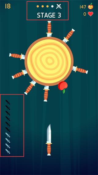 1、在【STAGE-3】中,圆靶旁出现苹果时,瞄准苹果位置投掷飞刀可额外获取奖励。