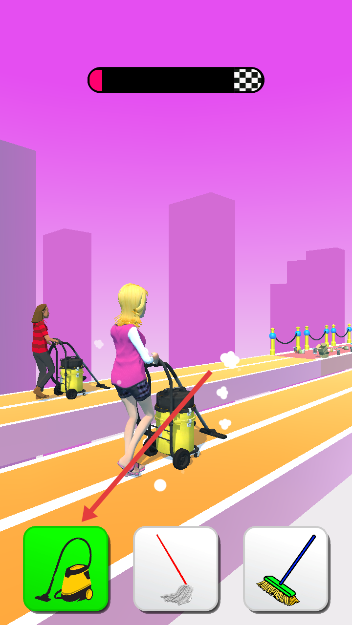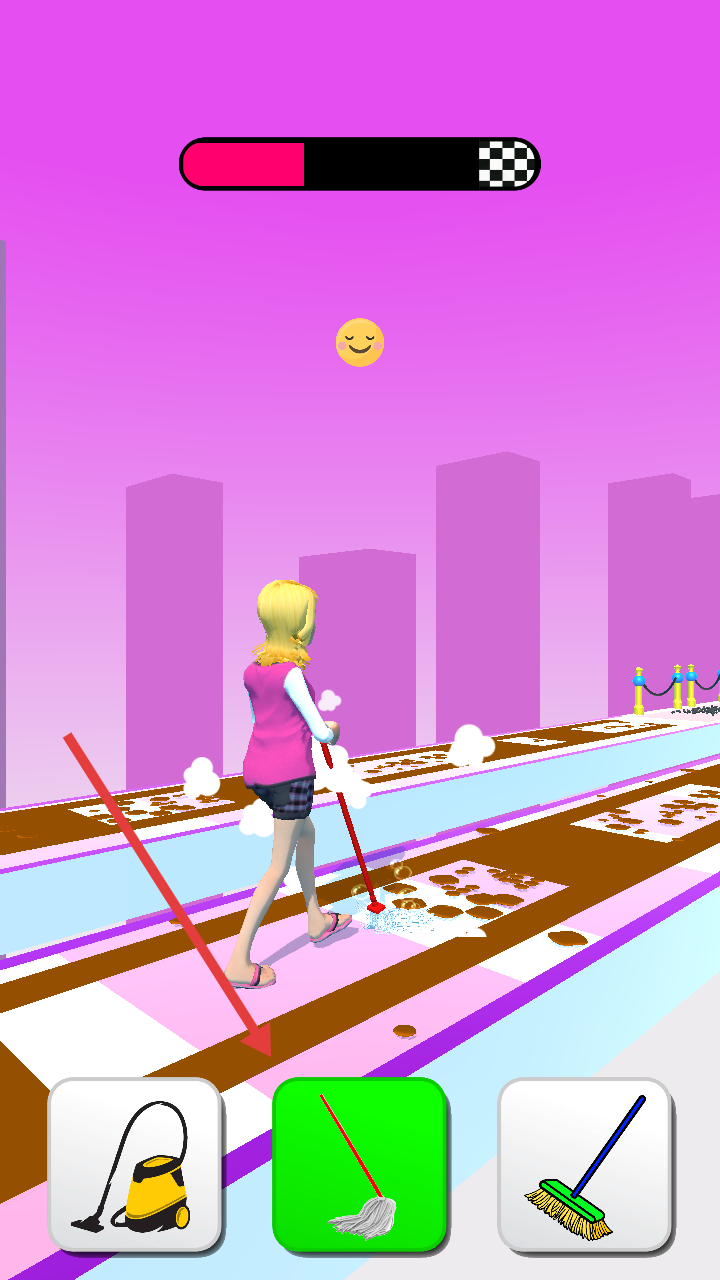 3、切换清洁工具,如拖把,清理赛道上的污渍,确保赛道清洁度达标,向终点推进。